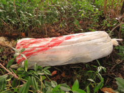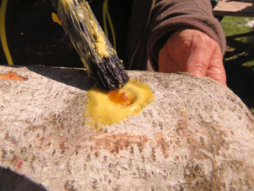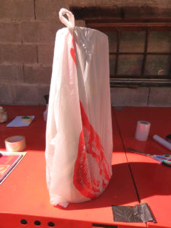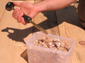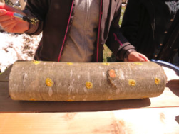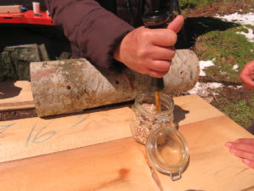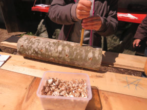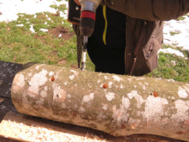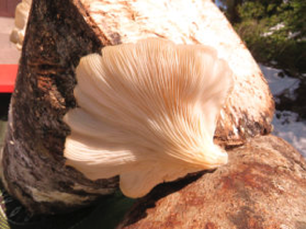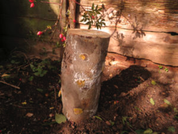 En avril dernier, nous étions une dizaine de personnes à suivre l’atelier organisé par les deux compères au hameau de la Tine (VD), dans le Pays d’En Haut. Après une présentation théorique et un pique-nique au soleil, chacun a reçu une bûche de hêtre, avec pour mission de l’inoculer avec du mycélium de pleurotes, opération délicate s’il en est. Car il faut travailler vite et bien, afin d’éviter que des spores d’une espèce indésirable n’occupe le terrain avant les pleurotes. Dans ma bûche, j’ai commencé par forer une trentaine de trous avec une perceuse. Ensuite, il a fallu introduire le mycélium cultivé sur grains de seigle avec un piston puis reboucher chaque trou avec de la cire fondue. En fin de journée, chacun est reparti avec sa bûche sous le bras, plein d’espoir de récolte facile. Au jardin, j’ai placé la mienne à même le sol, à l’ombre de la haie, soigneusement emballée dans un plastique troué, puis je l’ai oubliée durant tout l’été. Pendant ce temps, le mycélium s’est répandu dans les cellules du bois en profitant de la chaleur et de l’humidité. La preuve? Quand je l’ai déballée l’autre jour, la bûche était couverte d’un feutrage blanc et prometteur, tel qu’annoncé dans les consignes (voir galerie de photos ci dessous). Il ne restait plus qu’à lui faire faire trempette dans l’eau pendant 48 heures et à la dresser dans un coin humide et ombragé pour la suite des événements. Depuis, je scrute chaque jour l’apparition des premiers chapeaux. Pour l’instant, ils se font désirer mais je les sens qui frétillent d’impatience…C’est sûr, ils exploseront au prochain redoux!
