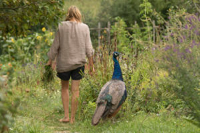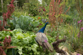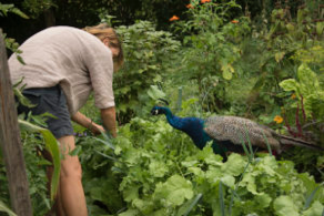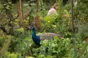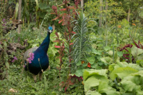 En permaculture, on dit toujours que chaque élément du jardin doit remplir une fonction et que, par souci de résilience, chaque fonction devrait être remplie par plusieurs éléments. Alors on me demande parfois à quoi peut bien servir un paon. Et bien Georges, puisque c’est de lui qu’il s’agit, embellit notre jardin. On peut ne pas aimer le bleu, on peut douter de l’intérêt de sa queue, mais on est bien obligé d’admettre que l’harmonie de son plumage est extraordinaire. Quand il émerge tête haute des hautes herbes, quand il se perche au sommet du prunier ou qu’il survole la terrasse, il est simplement magnifique et enveloppe tout le jardin de féérie.