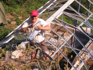 Pour ce qui est du détail, je vais commencer par la serre, car je risque bien de vous en parler régulièrement et il me tarde de vous la présenter! Il s’agit donc de la serre à plantons dont nous rêvions depuis longtemps. Adossée côté sud au potager du haut du jardin, elle est placée stratégiquement à côté de la maison et de nos réserves d’eau de pluie. L’an passé, mon mari Christian avait déjà réalisé le soubassement avec des blocs de béton: c’est là que nous avions enchassé de la paille pour faire des essais de cultures sur bottesen attendant la suite de la construction. Dans un esprit de permaculture, l’idéal aurait été de récupérer des vieilles fenêtres pour la bricoler, mais j’avoue avoir un faible pour la ferronnerie et je l’imaginais plutôt avec un look à l’ancienne et de jolies volutes sur le toit. Séduits par cette idée, Amélie et Alexandre Pietrzykowski, artisans-ferronniers des Clées, un village voisin, ont accepté de relever le défi et de créer toute la structure.