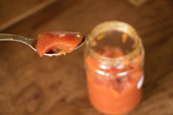 On connaît bien les vertus culinaires et médicinales du sureau noir(Sambucus nigra), qu’il s’agisse de ses fleurs ou de ses fruits. Son cousin le sureau rouge (Sambucus racemosa) est par contre nettement moins populaire. Sans doute parce qu’il pousse plus volontiers en montagne qu’en plaine et que, par conséquent, il se mérite un peu plus… Comme je ratais souvent le bon moment pour aller cueillir ses grappes de baies rouges dans les clairières forestières du Jura, j’ai fini par planter plusieurs arbustes au jardin, ce qui est encore possible à notre altitude (670 m) . Au printemps, les fleurs couleur crème du sureau rouge ne paient pas de mine. Ses fruits rouge corail en revanche, à maturité ces jours ci, sont terriblement décoratifs et j’ai mis un bon moment à me résoudre à les cueillir pour en faire une fameuse gelée au parfum sauvage.