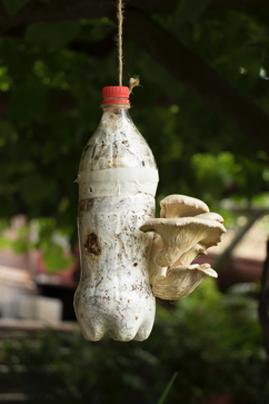 Dans la foulée des saveurs forestières, des pleurotes ont jailli ces derniers jours de la botte de paille inoculée le 5 mai dernier lors d’un atelier avec Champibûches. Franchement, je n’y croyais plus trop car la botte un peu oubliée sous la haie et sous son plastique noir me paraissait trop sèche et peu habitée. Erreur! Quand on a soulevé la bâche l’autre jour, il y avait non seulement des petits bouquets de pleurotes, mais aussi une jeune couleuvre vautrée sur la paille. Nous avons ôté la bâche et, le lendemain, boostées par la canicule, les pleurotes avaient déjà doublé de volume et rameuté toutes les limaces du quartier. Les bouquets accrochés à la verticale n’ont pas pu échapper à leurs langues voraces. Par contre, j’ai pu sauver les champignons campés à l’horizontale en les ceinturant de quelques granules d’orthophosphate de fer. Dans la cuisine, les champignons ont bourgeonné au même moment sur la bouteille en PET que nous avions remplie d’un mélange de paille, de marc de café et de mycélium de pleurotes. Ici pas de limaces à craindre, seulement des coups de tête contre leur support accroché au plafond au bout d’une corde. Par mesure de sécurité, nous sommes allés aux champignons vite fait, car comme dans la forêt, il vaut mieux ne pas trop les faire attendre.